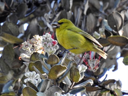 - ʻAmakihi, another native forest honeycreeper, but not mentioned in our story, looks a lot like Kiwikiu! You may need your binoculars to take an even closer look! ʻAmakihi, is yellow green, has a more dominant black “mask” at its eyes, and a fluffier tennis ball like feathered body. A close look at these birds beaks will help you identify them for sure. Just remember, Kiwikiu led the “snack break” for all his feathered friends with his strong, curved, thick, parrot like beak! No, Kiwikiu is not related to parrots! You’ll likely see more ʻAmakihi while bird watching, there are more of them in the forest to see! They are abundant. Poor Kiwikiu is endangered.
